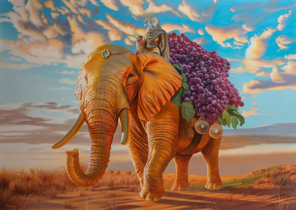 Pintura cargada de simbolismo y poder. En esta visión, un enorme elefante dorado llega solemne, alzando su trompa al cielo como emblema de grandeza y prosperidad.