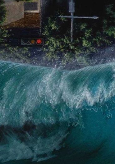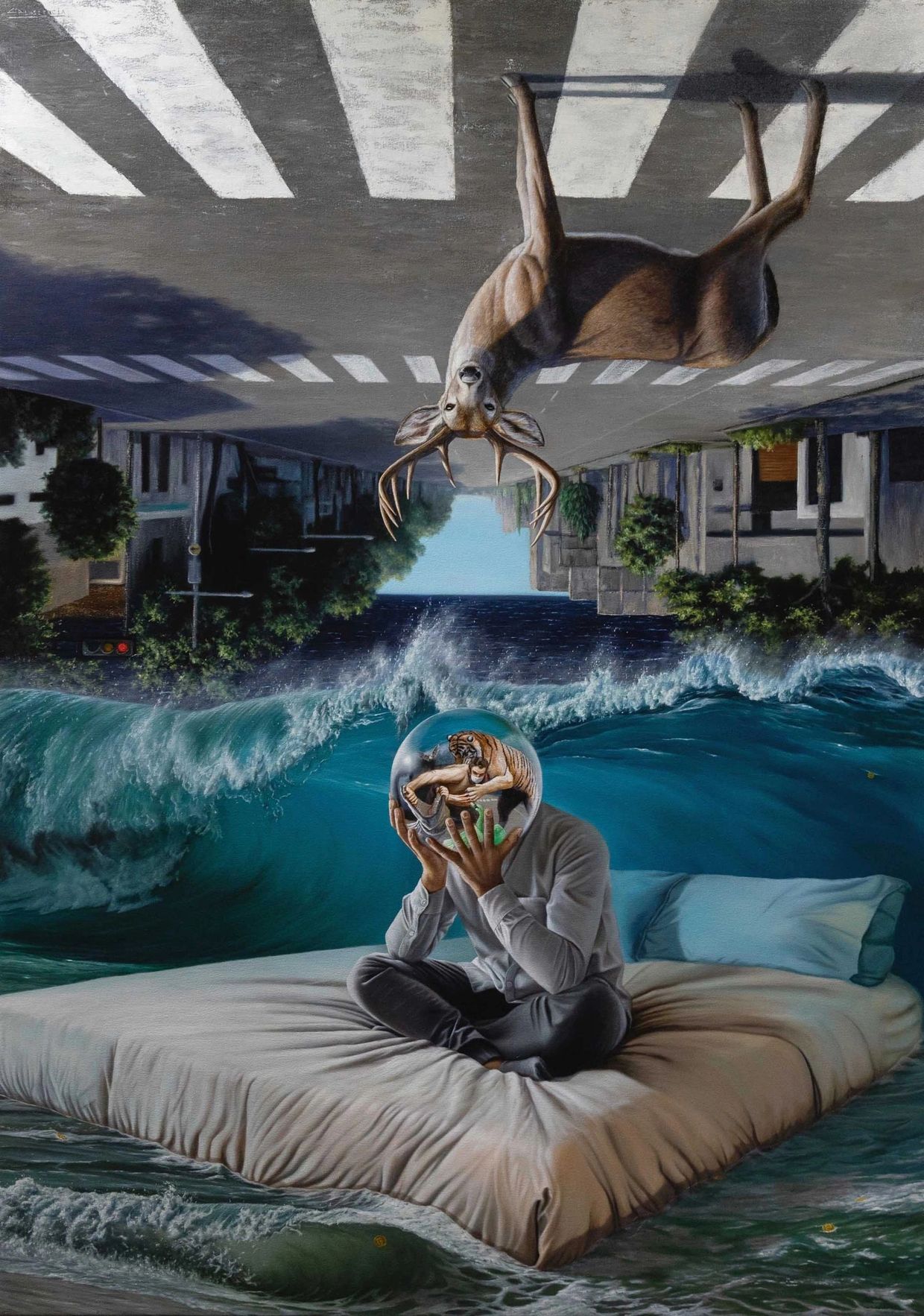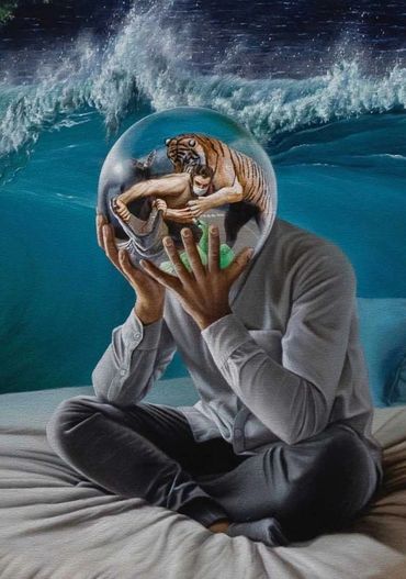 Zona inferior. Un hombre angustiado, sentado en su cama, no puede descansar. Su cabeza, una esfera transparente, deja ver pensamientos y emociones que lo atormentan: un hombre con cubrebocas lucha contra animales en alusión a Rubens (Caza de tigre). El cocodrilo simboliza miedo e incertidumbre; el tigre, la fortaleza que lo ataca por la espalda; un cisne verde, inspirado en el libro El cisne verde del BIS, representa la crisis económica; y un murciélago alude al posible origen del virus. La cama, arrastrada por una ola, refleja la inestabilidad, mientras monedas flotan irónicamente sobre el agua, símbolo de la volatilidad del dinero.