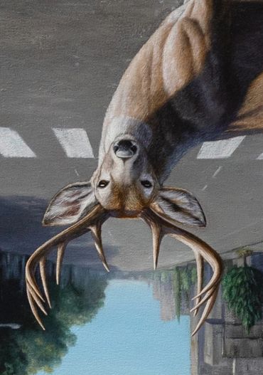 Zona superior, invertida. Una calle desolada, sin personas ni autos, ha sido tomada por animales. Un venado nos observa fijamente, su cornamenta amenaza la esfera del personaje. El semáforo en rojo muestra la icónica forma del virus, recordando el confinamiento.